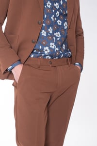 Abito con giacca monopetto sfoderata e dettagli interni, impunture su rever e tasche, chiusura pantaloni con gancetto e bottone.