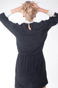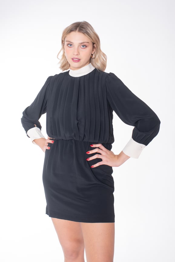 Abito corto, con pieghe sul davanti, manica 3/4, elastico in vita, collo a contrasto con bottoni e polsini a contrasto.