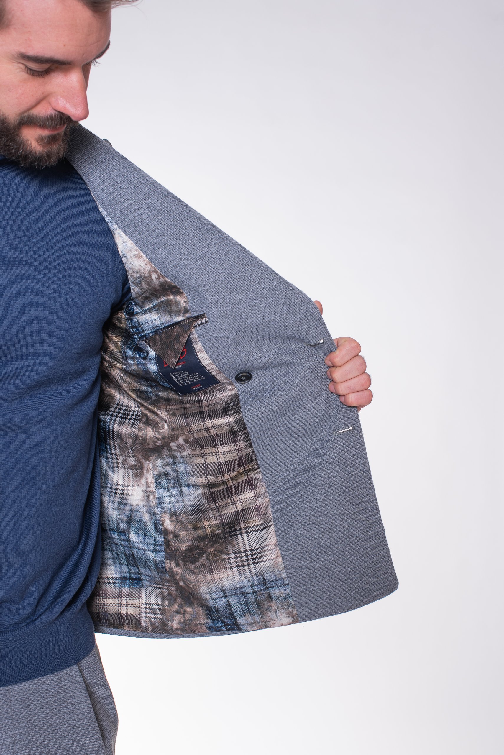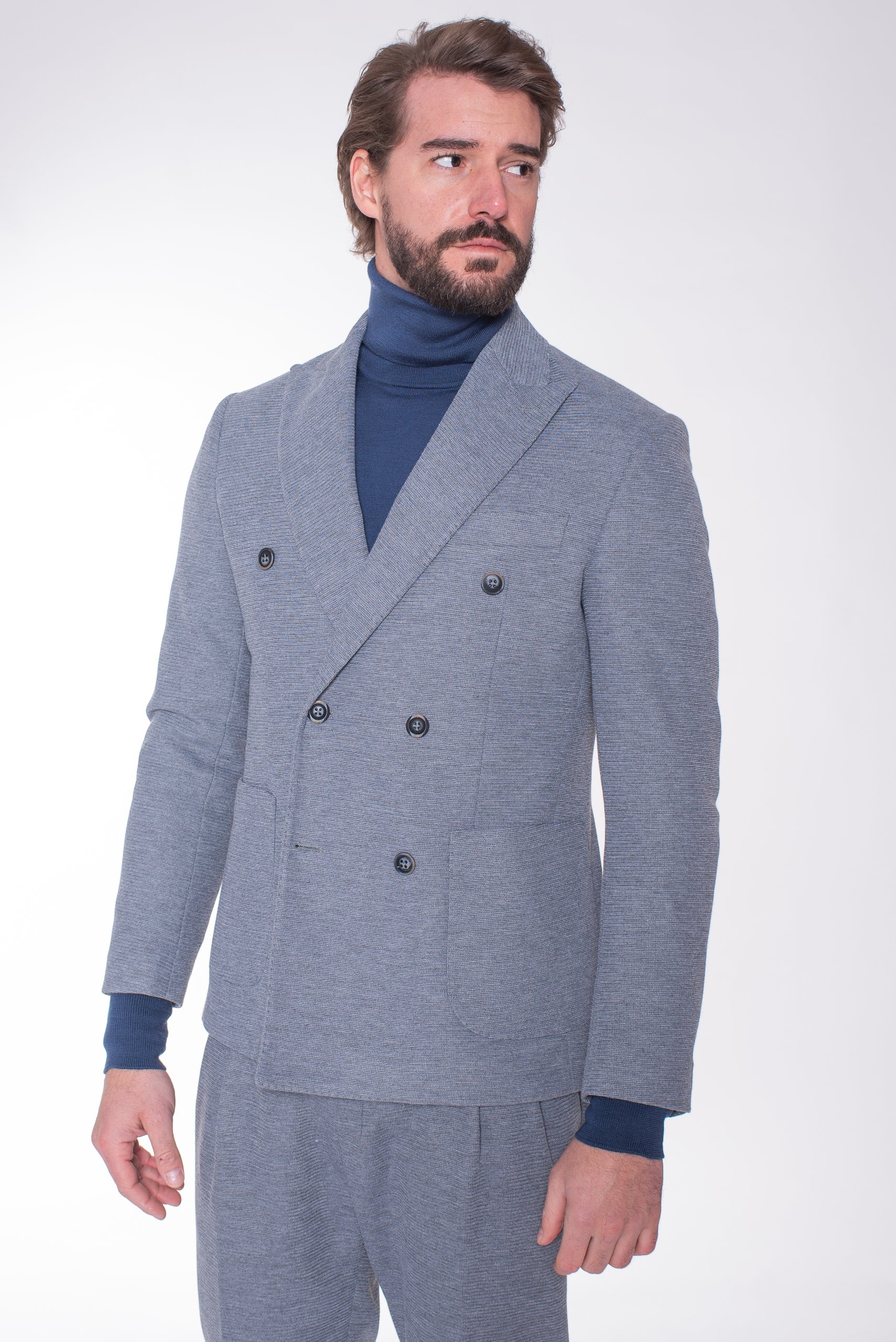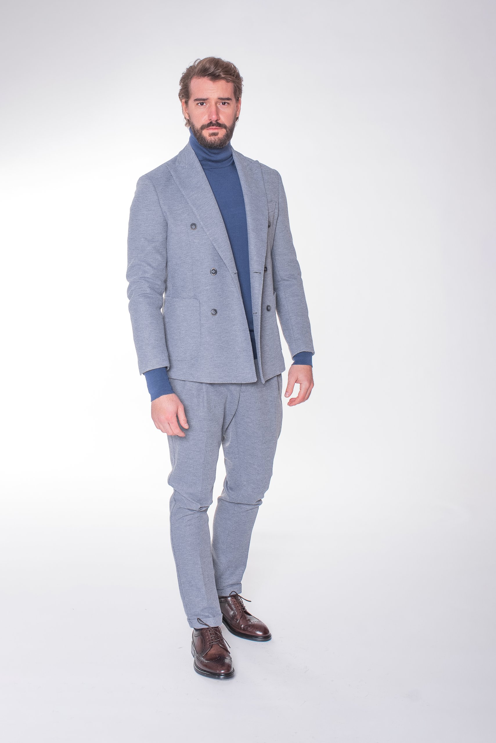 Abito con vestibilità asciutta, giacca doppiopetto, pantalone con risvolto.