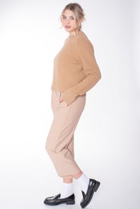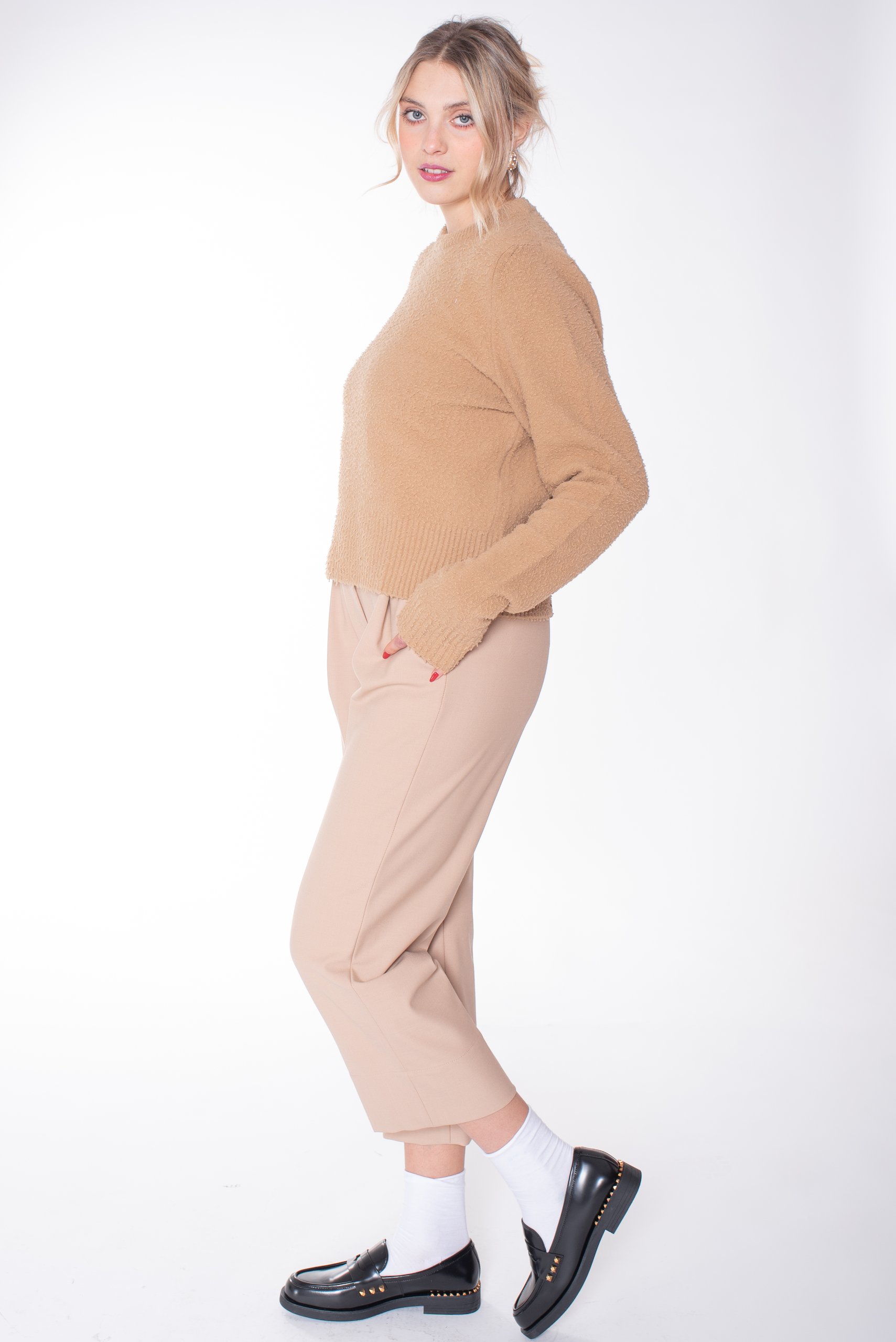 Vita alta con pence, vestibilità ampia su fianchi e cosce, chiusura con gancetti e cinturini regolabili applicati sui fianchi