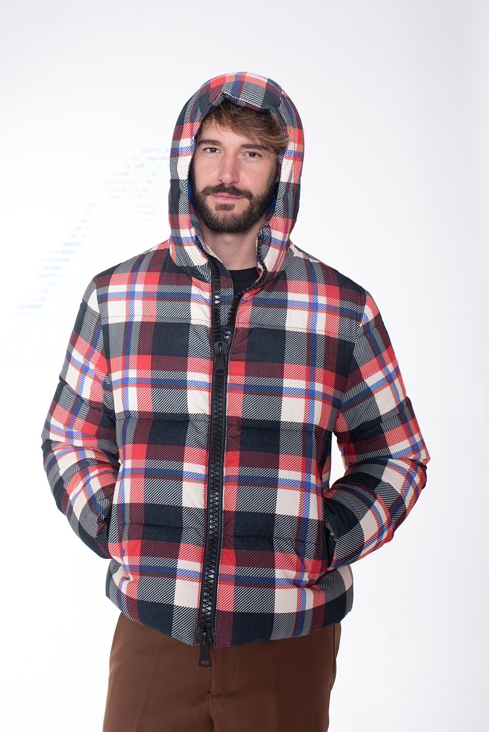 Piumino a quadri in pura piuma d’oca, ideale per la stagione più fredda. La fodera in velluto e la stampa rendono questo capo raffinato e moderno.